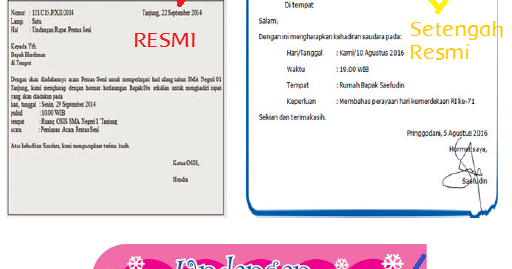 Contoh surat undangan resmi dinas pendidikan. Untuk surat undangan tidak resmi ini, biasanya digunakan oleh perseorangan dan untuk urusan pribadi. Menulis surat undangan tidak resmi terlbilang lebih mudah daripada undangan formal. Sedangkan surat undangan tidak resmi ialah surat undangan yang dibuat untuk acara yang tidak resmi / formal, bisa acara ulang tahun, pernikahan biasa, dan acara non formal lainnya. Surat undangan tidak resmi dapat dibuat oleh siapa saja.