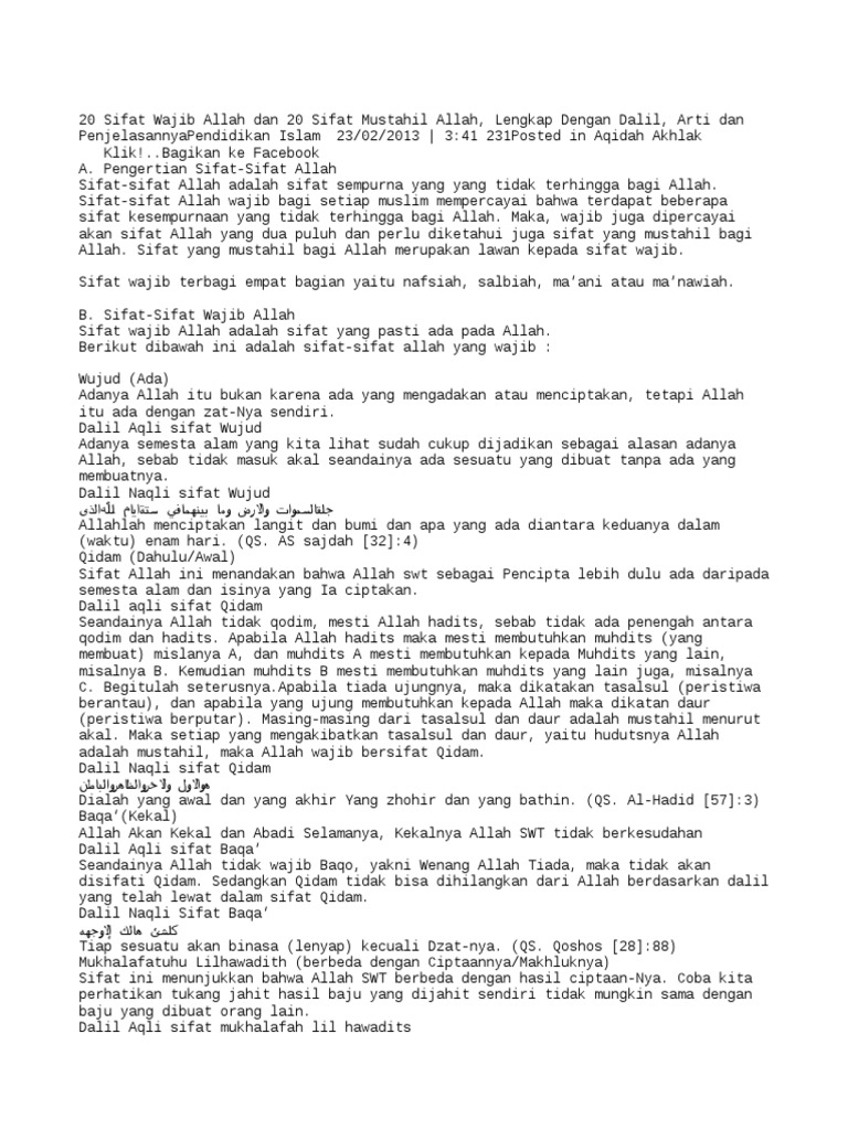 Setelah mengetahui, memahami, mengimani, mengi'tiqadkan dan meyaqini 20 sifat wajib bagi allah, maka masih wajib mengetahui lawan kata sifat wajib yaitu sifat mustahil. Sifat salbiyah adalah sifat yang hanya dimiliki oleh allah sifat ini terdapat dalam lima sifat allah, yaitu qidam, baqa, mukhalafatu lil hawaditsi, qiyamuhu binafsihi, dan. Inilah tabel latin arab, arab dan arti dari 20 sifat wajib allah yang wajib umat islam ketahui. Maksudnya adalah bahwa allah merupakan dzat yang ada. Sifat wajib allah yang pertama yaitu wujud yang artinya ada.